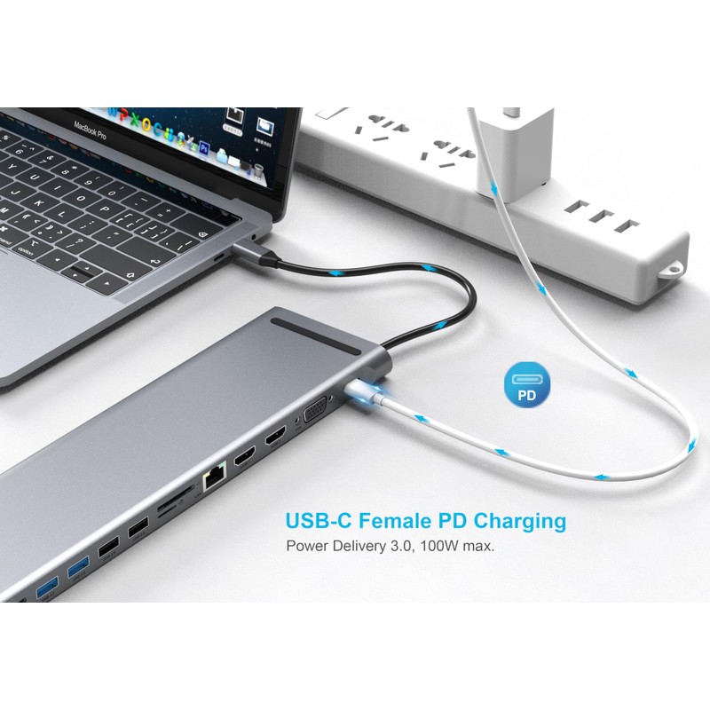 13-in-1 Triple Display USB C Docking Station with Dual 4K HDMI, VGA, Four USB Ports, an SD/TF Card Reader, 3.5 Microphone/Audio Port, RJ45 Ethernet, and USB C PD