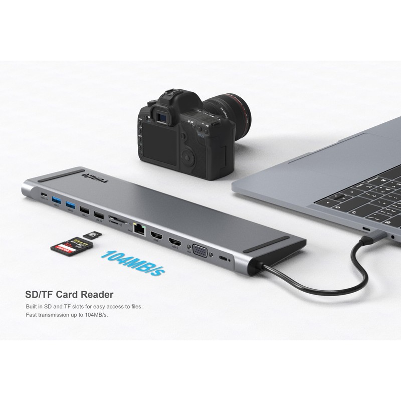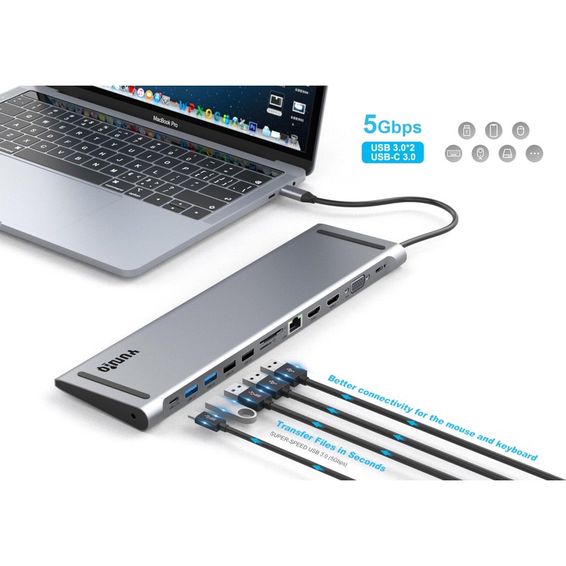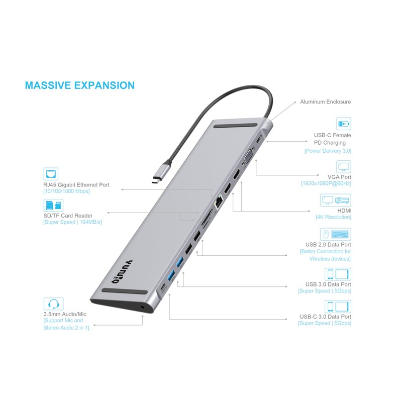 - 13-in-1 laptop features a massive expansion docking station, Simply plug in and operate. Gigabit Ethernet, 3.5mm audio/mic, USB C PD, SD, TF card readers, 4K HDMI, USB 3.0 5Gbps, and USB 2.0 ports.