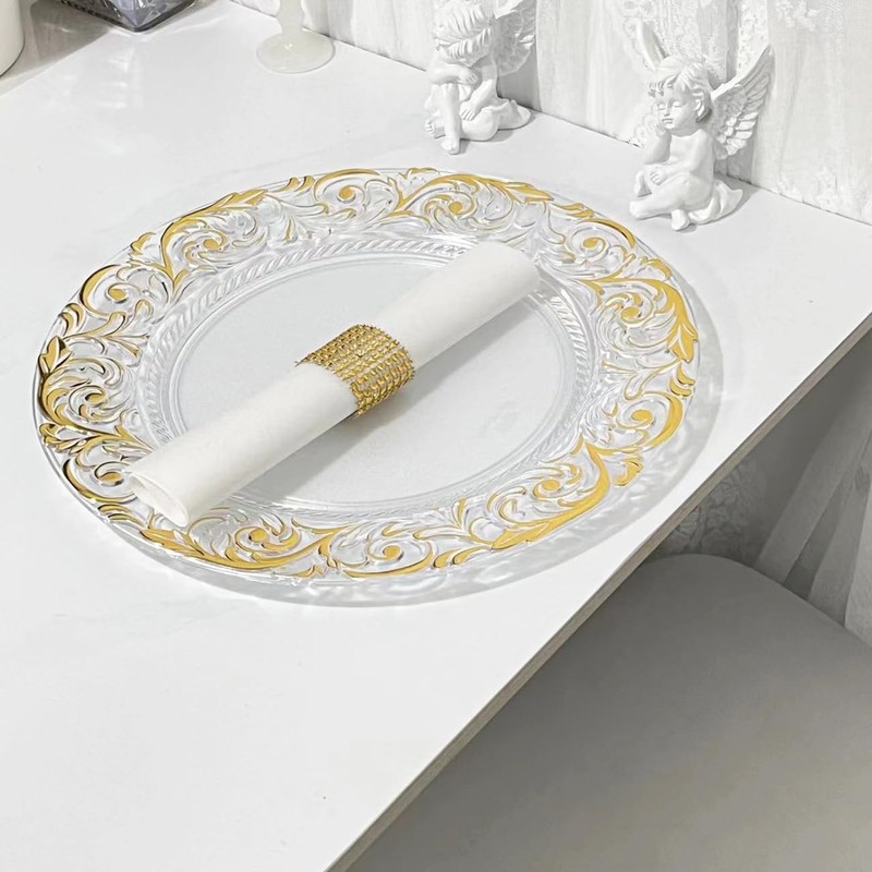 - High-grade material: The gold clear charger plate is 13 inch in size, made of high-quality plastic, not easy to scratch and can be reused. The quantity of 12 packs can meet your needs in different occasions.