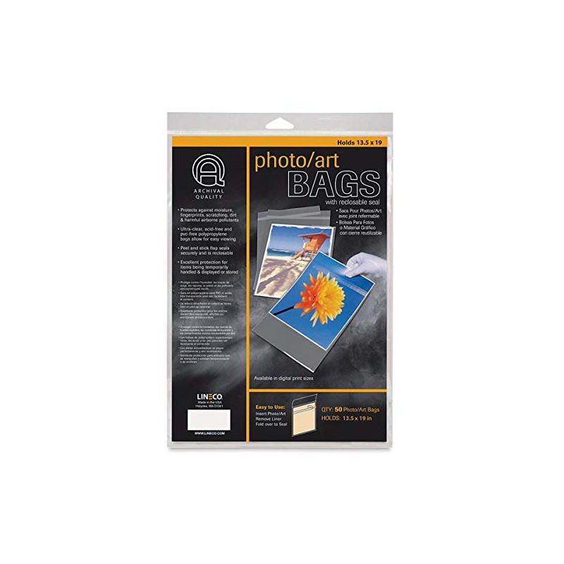 Self-sealing 2 mil clear polypropylene bags are an economical archival storage alternative, sealing out dust and dirt while protecting photos from fingerprints and acid skin oils. - Lineco Photo Art Bag Pack - 13-1/2" x 19", Pkg of 50Photo Art Bags 10 Pack, 13X19 50PK -
