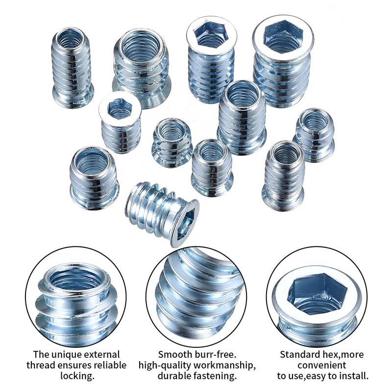 • Ingenious Design: These insert nuts boast a standard hex head, flanged thread structure, and impressive tensile strength, effectively preventing removal caused by torsion or vibration during use.