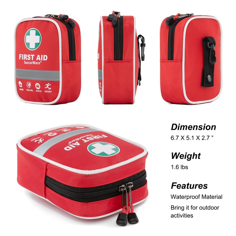 - SMALL AND LIGHTWEIGHT - Our 1st aid kit measures just the right amount of 17.1cm x 12.9cm x 6.9cm (6.7" x 5.1" x 2.7") ; It weighs only 725g (1.6 lbs). Just bring it with you when you're out and about, and your basic care needs can be addressed. For your safety, perfect for traveling, skiing, car, office, home, kitchen, road trip, boat carry-on.