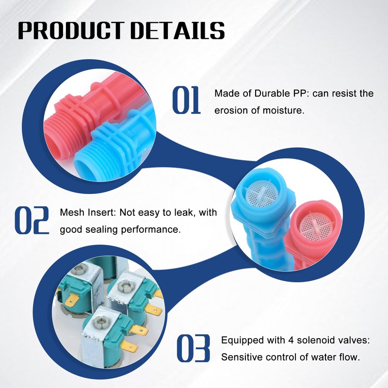 - 【FUNCTION】: This assembly controls the flow of hot and cold water into the machine, opening and closing as needed during the washing cycle, while filtering out impurities in the water,this assembly has 4 coil water valves.