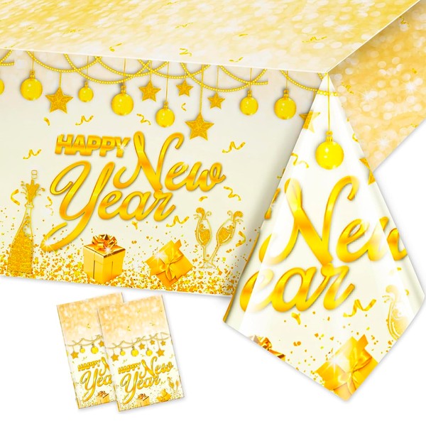 137 * 274cm Happy New Year Eve Table Cloth Party Plastic Tablecloths,2Pcs White Gold Large New Year TableCloth Happy New Year Eve Party Dinner Tablecover for 2025 New Year Eve Party Table Decorations