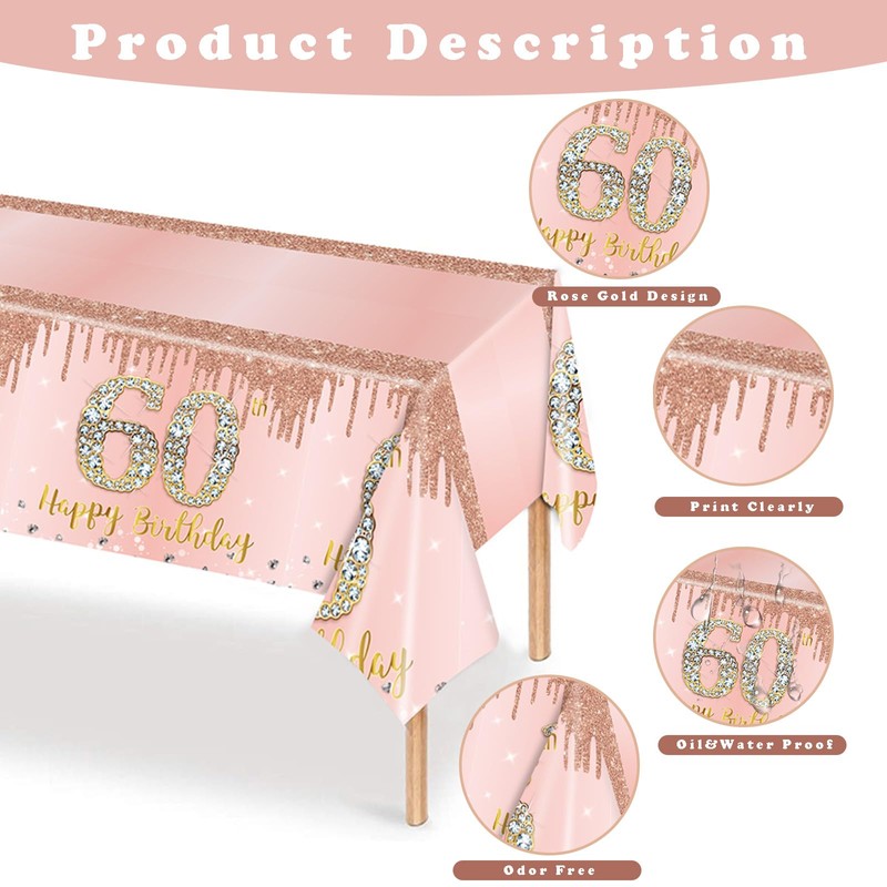 137*274cm Large 60th Rose Gold Table Cloth,60th Birthday Decorations for Her,Rose Gold 60th Birthday Party Plastic Disposable Table Cloth Tablecover for Her Birthday Gifts,60th Birthday Party Supplies