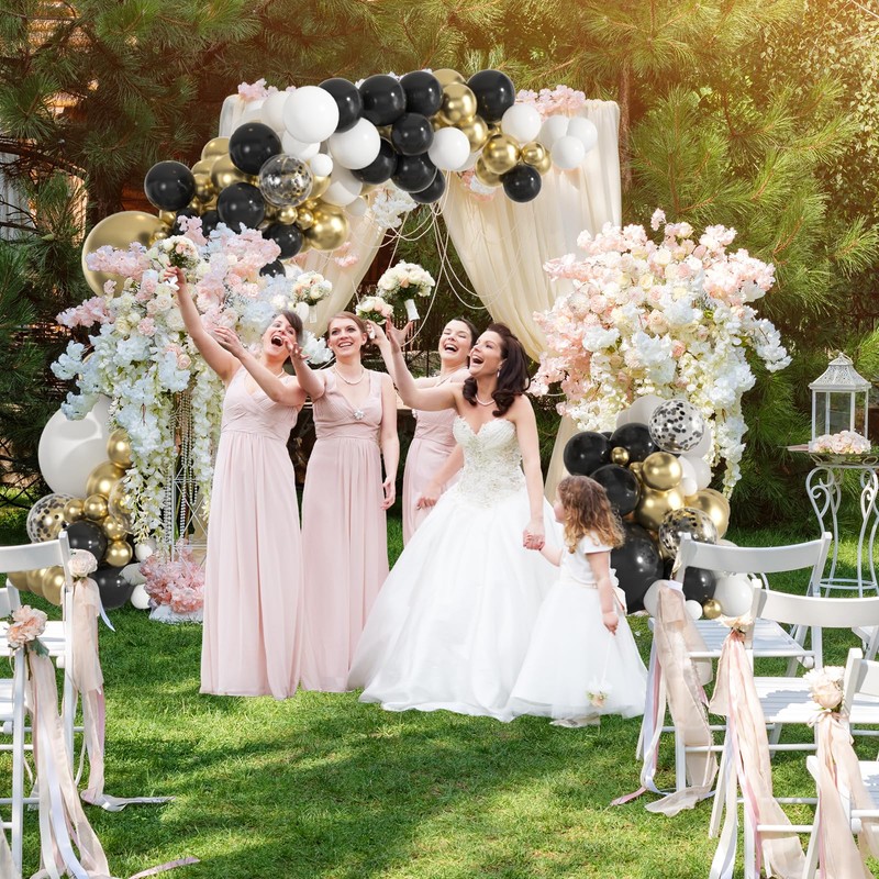 Designed for 2025 graduations, weddings, and upscale parties, this set blends matte black, metallic gold, and confetti-filled balloons in four sizes (18”, 12”, 10”, 5”) for dynamic texture and depth.