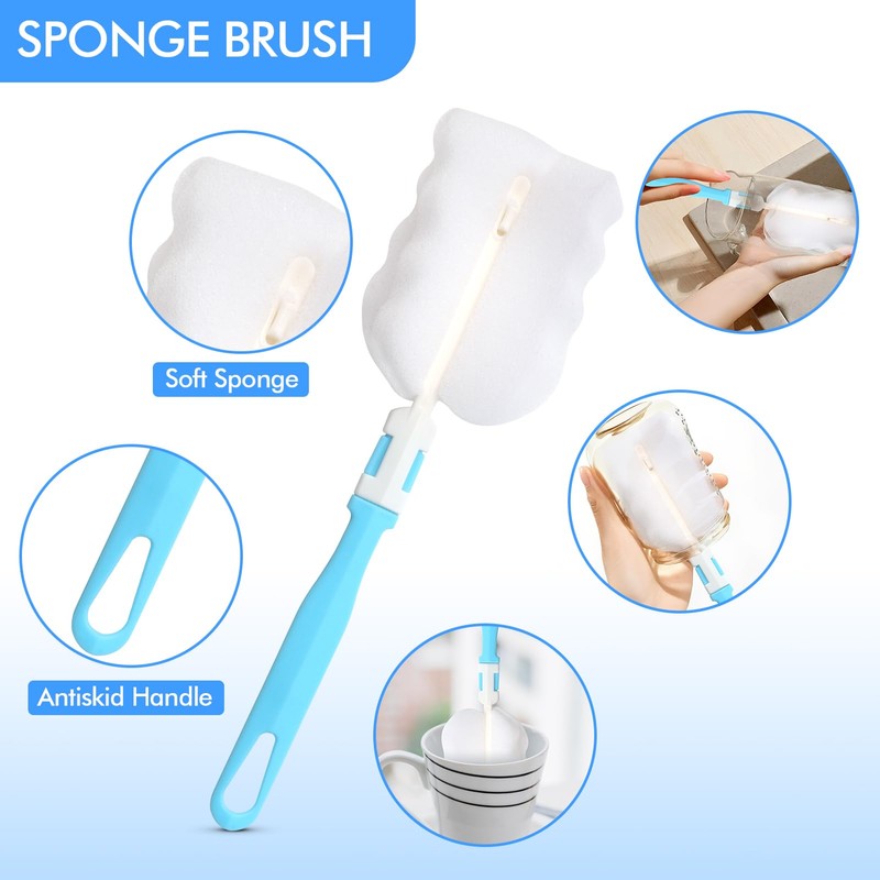 - [Long Handle Brush] 14-inch extra-long curved brush easy To grip, perfect for cleaning the mouthpiece and straight tube. And sponge cup brush is soft and will not scratch the cup, ideal for cleaning narrow-necked bottles such as glass bottles, vases, long-necked wine bottles, flasks, measuring jars, conical bottles, etc.