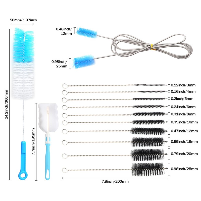 - [Package Including] Tube pipe cleaners brush set includes 1pcs 78.8inch/200cm flexible double-ended hose cleaning brush,1pcs 14.2inch/36cm long handle brush, 10pcs long 7.8inch/20cm different diameters brushes,10 different brush diameters:0.98/0.79/0.59/0.47/0.39/0.31/0.24/0.2/0.16/0.12inch(25/20/15/12/10/8/6/5/4/3mm), and 7.7inch/19.5cm sponge cup brush.