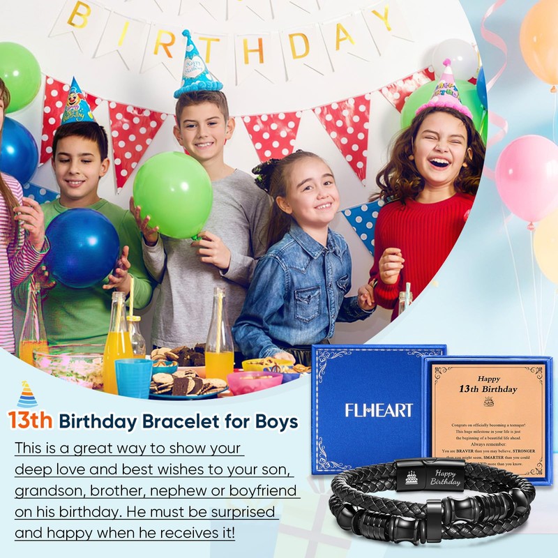 - Happy 13th Birthday Gifts: Turning 13 is a milestone in becoming a teenager, and a new journey in life is about to begin. He is now officially a teenager, and what a wonderful one at that! Gift a heartfelt 13th birthday gift for your son or special boy with this leather bracelet that symbolises love and wishes.