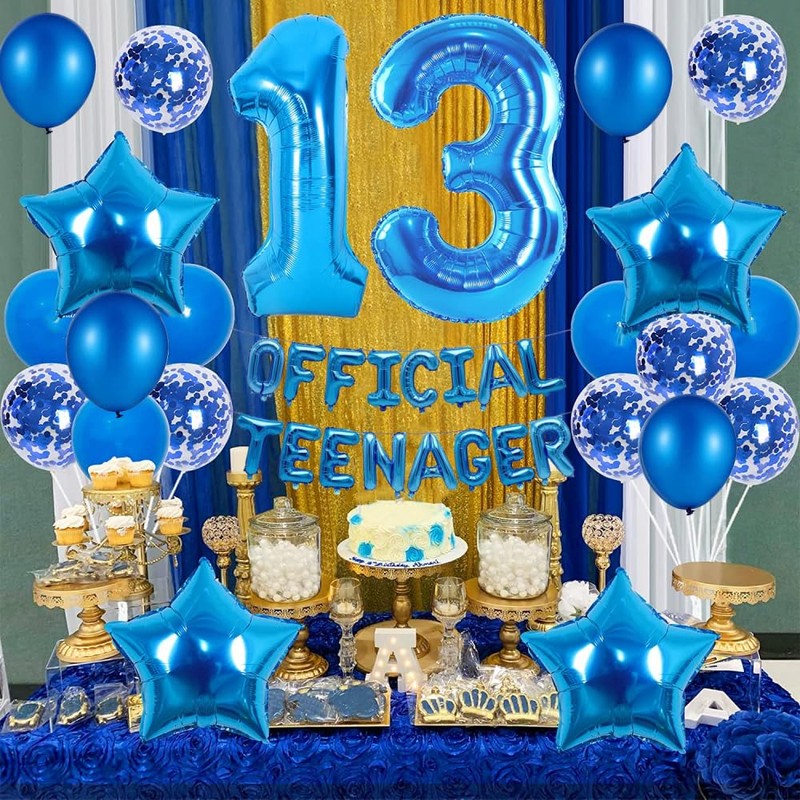 - ❤ 【Blue 13th Birthday Decorations】1x Official Teenager Balloon Banner,1x Happy Birthday Blue Banner,1x32in Number 13,4x Star Shape Balloons,10x Blue Latex Balloons,10x Blue Confetti Balloons,3x Ribbon,1x Straw.