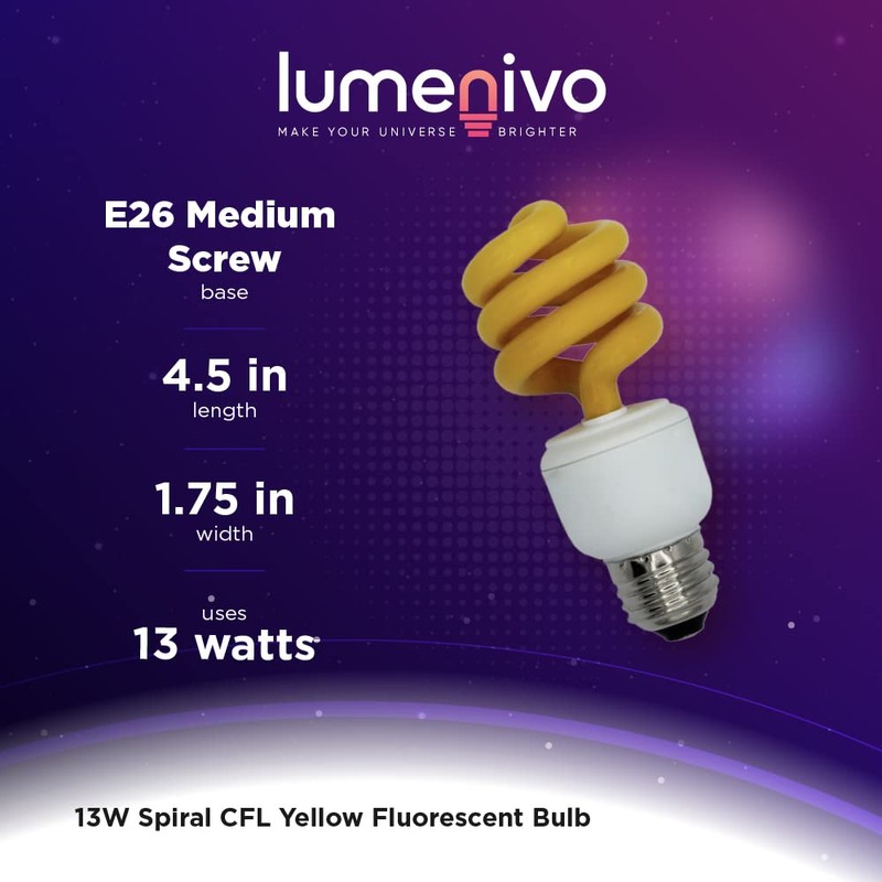 13W Yellow Light Bulbs Spiral CFL by Lumenivo - E26 Medium Base Porch Lights That Don't Attract Bugs - Bug Repellent Lights Outdoors and Indoors - 120V - 2 Pack