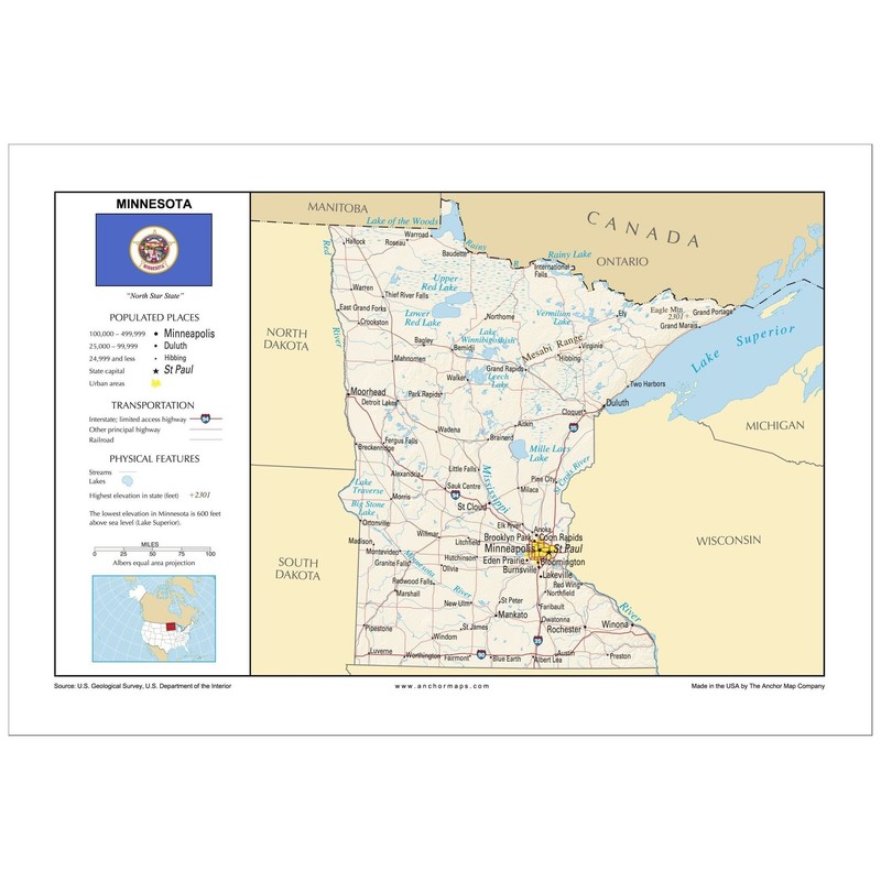 13x19 Minnesota General Reference Wall Map - Anchor Maps USA Foundational Series - Cities, Roads, Physical Features, and Topography [Rolled]