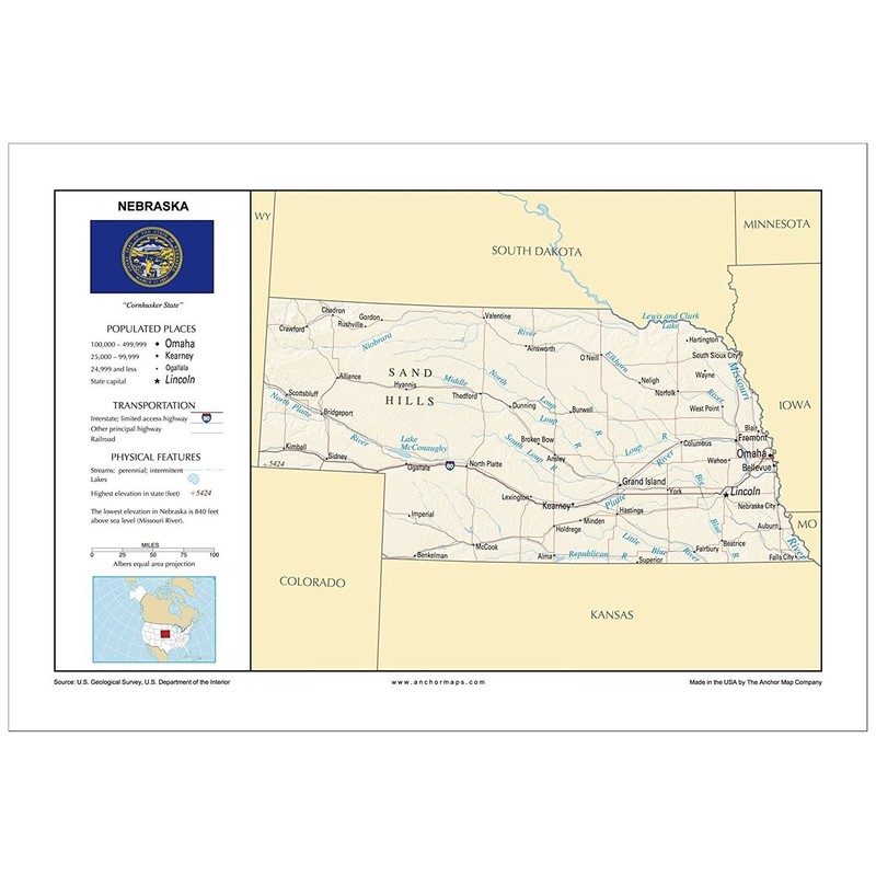13x19 Nebraska General Reference Wall Map - Anchor Maps USA Foundational Series - Cities, Roads, Physical Features, and Topography [Rolled]