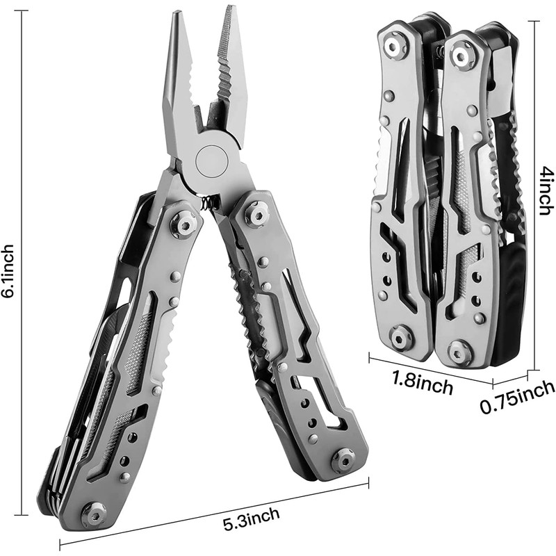 • Rugged Construction: Each tool is made of thickened 420 stainless steel which makes the multitool super solid and sturdy and guarantees years of reliable performance. High quality stainless steel prevents the pliers from rusting so as to ensure an enduring lifespan