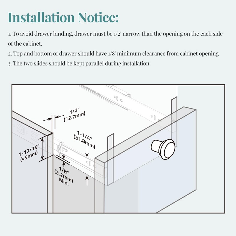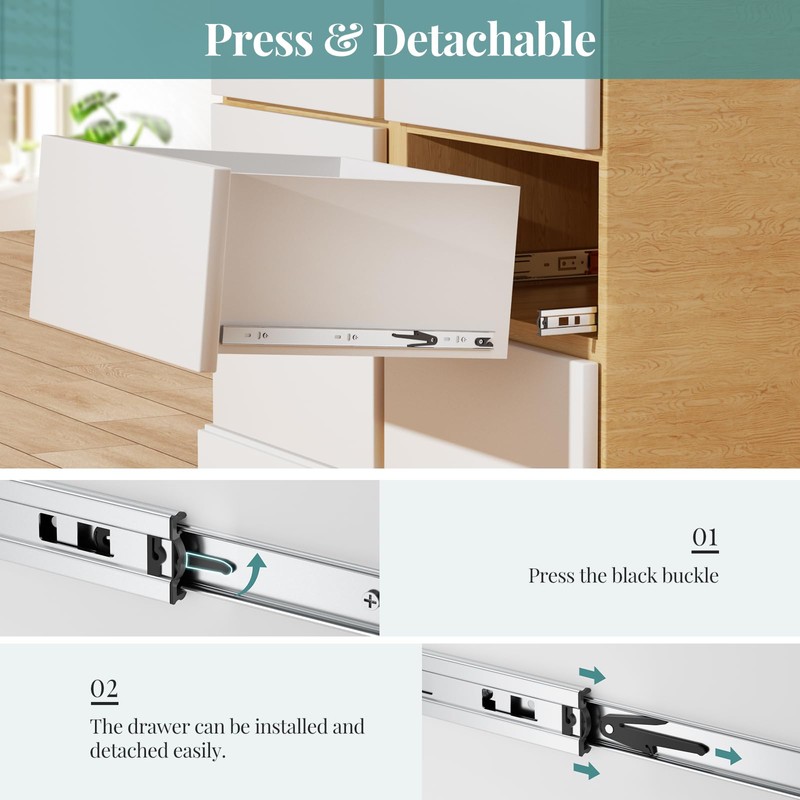 - 【Press & Deatchable】There is a plastic buckle on the back of the side mount drawer slides, by pressing it,the 3rdtrack(the narrowest section) can be separated ,which means the drawer can be installed and detached easily by your will.