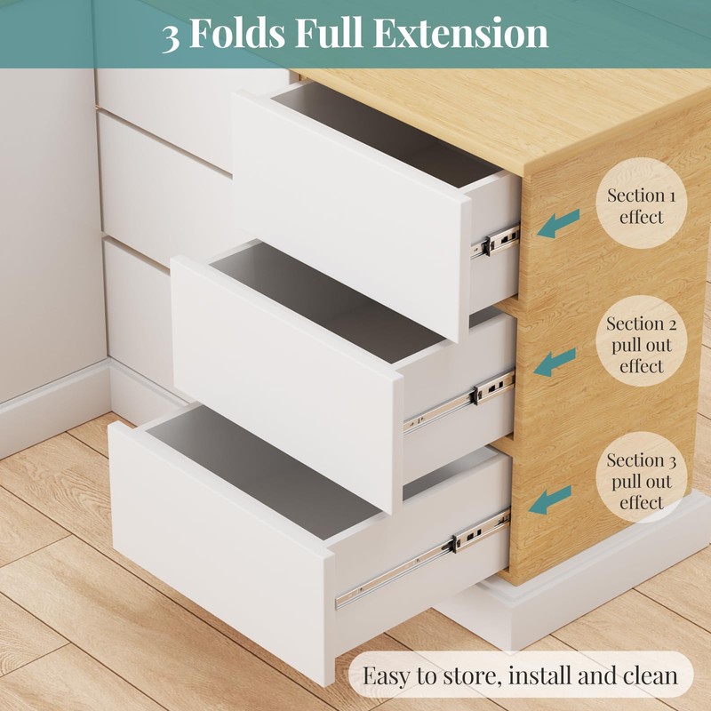 - 【3-Fold full extension】The full extension drawer slides enable 3-fold fully extend, which designed to extend your drawer to a full open position so that you can access anything in the drawer without reaching under the lip of your cabinet.
