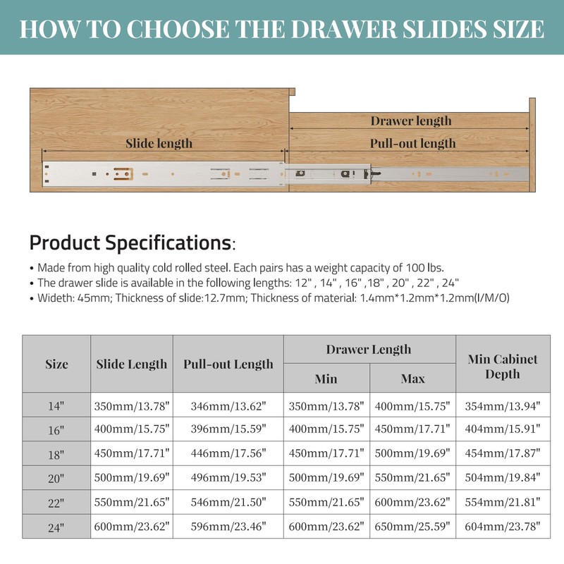 - 【Installation Guide】Slide length:13.78"(350mm), Quantity: 1 pair(2 pieces), .Rail thickness: 0.5" (12.7mm). Rail width:45mm, Thickness of materia:1.4mm*1.2mm*1.2mm(I/M/0). Pull-out length:13.62"(346mm),suitable for drawers with internal depth ≥ 13.94"(354mm). 12 mounting screws are included in both ends of the product package. When installing, please push the inner ball bearing to the top of the slide rail first, then connect it with the slide rail, and finally complete the installation with a slight push.