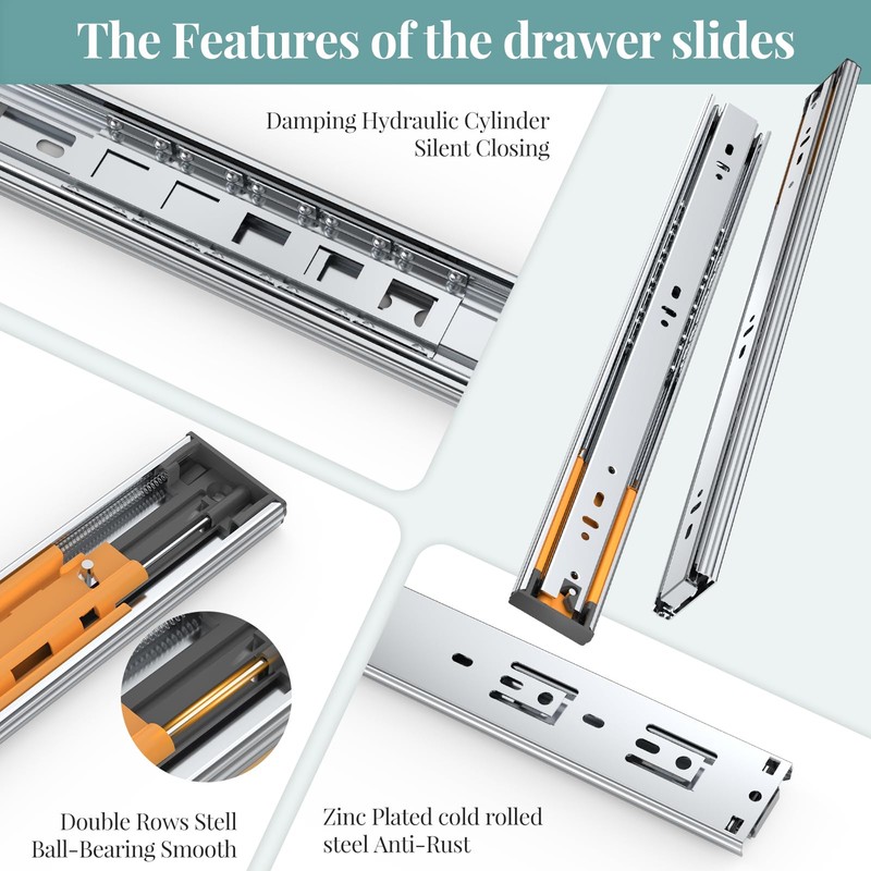 - 【Soft Close Drawer Slides 】The soft close drawer slides equipped hydraulic damper which allows the slides achieve soft close effect.Double spring design make less noise when close and open, create a warm and quiet family environment for you.