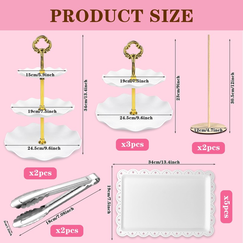 - What You Will Get: The complete dessert display set includes: 14 pcs (cupcake stands, appetizer trays, donut stands, and stainless steel tongs) in elegant white