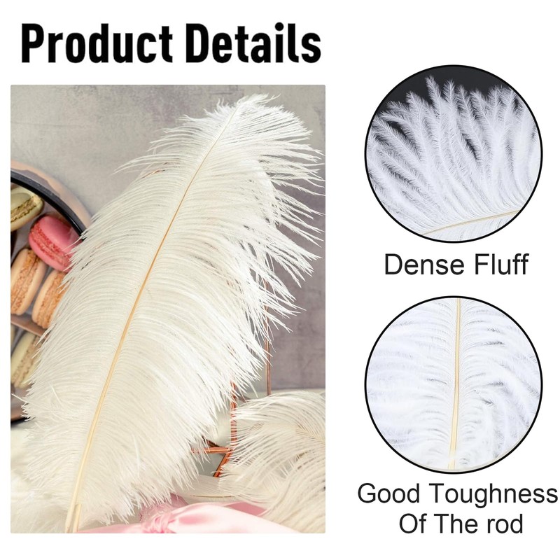 - 【Natural Ostrich Feathers】White Ostrich Feathers that are 100% genuine natural ostrich feathers plumes. All the feathers were lost naturally, no plucking was needed and no ostriches were harmed. The center shaft of ostrich feathers is made of high-quality fine rods, coarse and hard but not easy to break. Fluffy and plump feather piece down with gorgeous color and excellent texture.