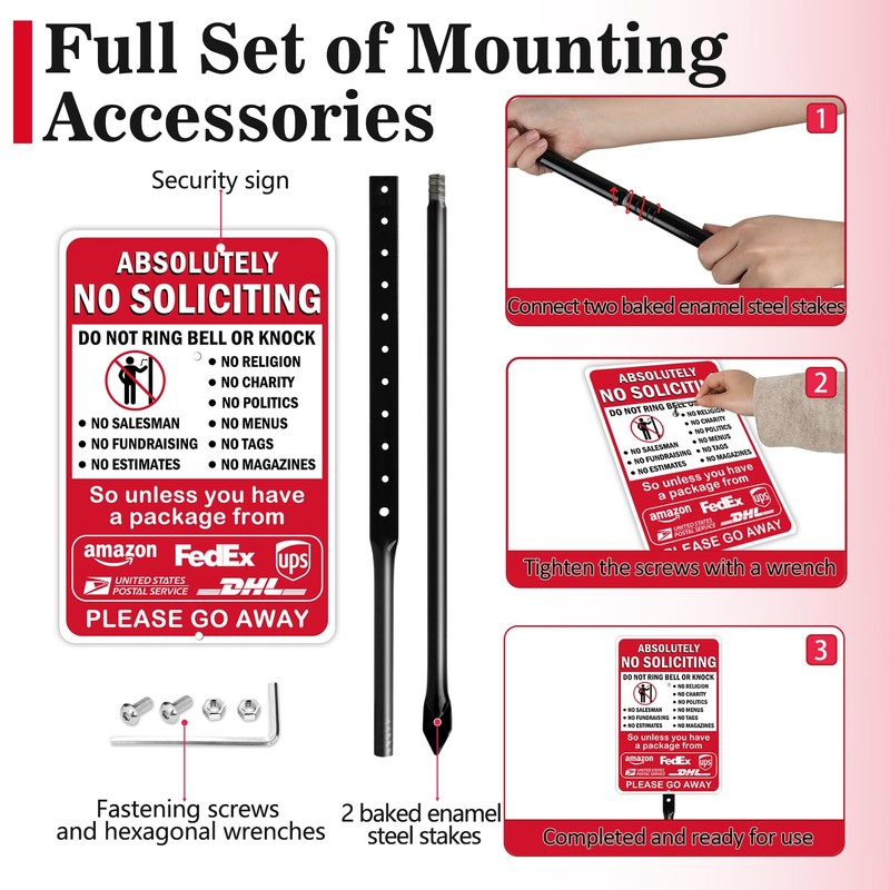 - COMPLETE PACKAGE: Each "absolutely no soliciting yard sign" kit includes one 14 x 10 inch sign with 2 baked enamel steel 18-inch tall pointed stake (Combination Mounting), and 4 fastening screws and hexagonal wrenchesfor easy mounting.