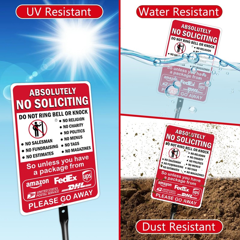 - STURDY HEAVY DUTY STEEL STAKE: Unlike cheaper stake signs, this absolutely no soliciting yard sign features a bend-proof steel 36 inches stake with an enamel coating it provides a reliable and stable demonstration that will not shake.