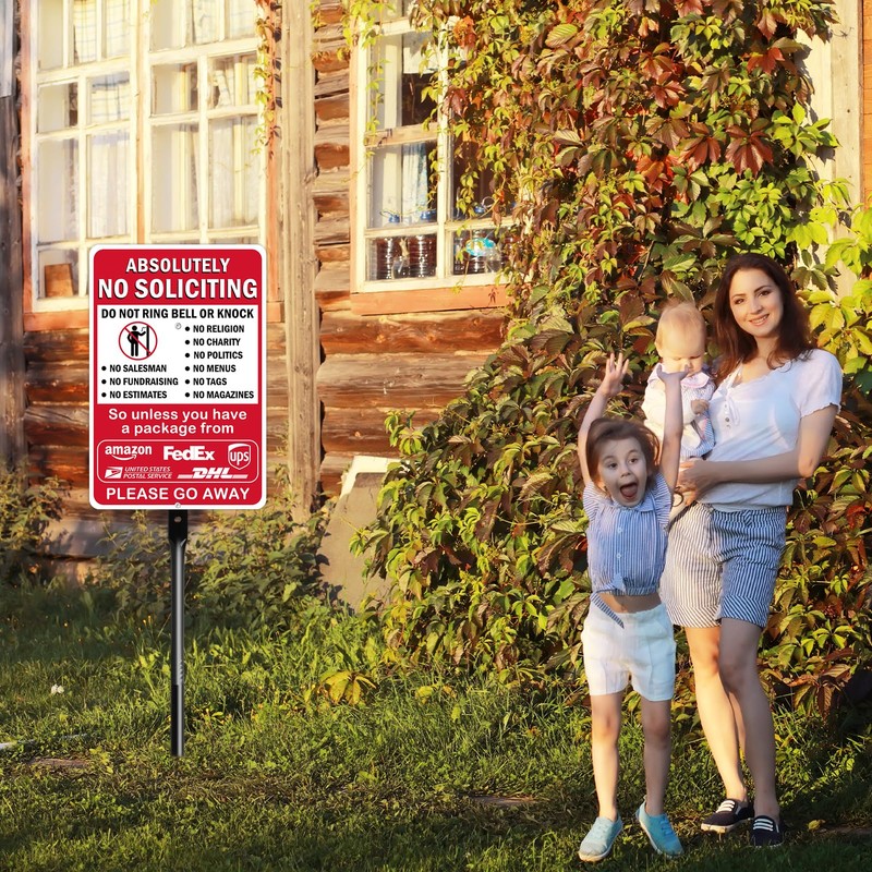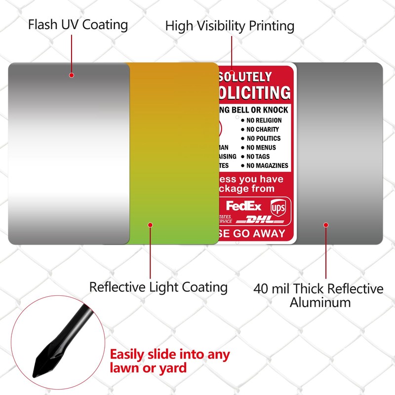 - DURABLE CONSTRUCTION: Absolutely no soliciting yard sign is made of heavy-duty 40 mil thick aluminum, our no soliciting signs boast exceptional durability. Aluminum signs outlast plastic signs, which can be torn off more easily. They easily withstand harsh outdoor conditions for years.