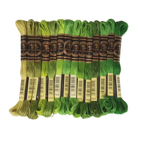 - 14 VIBRANT COLOURS: Our set includes 14 shades of green embroidery thread (469, 470, 471, 472, 904, 905, 906, 907, 699, 700, 701, 702, 703, 704). You’ll never be stuck for the right shade of green again!