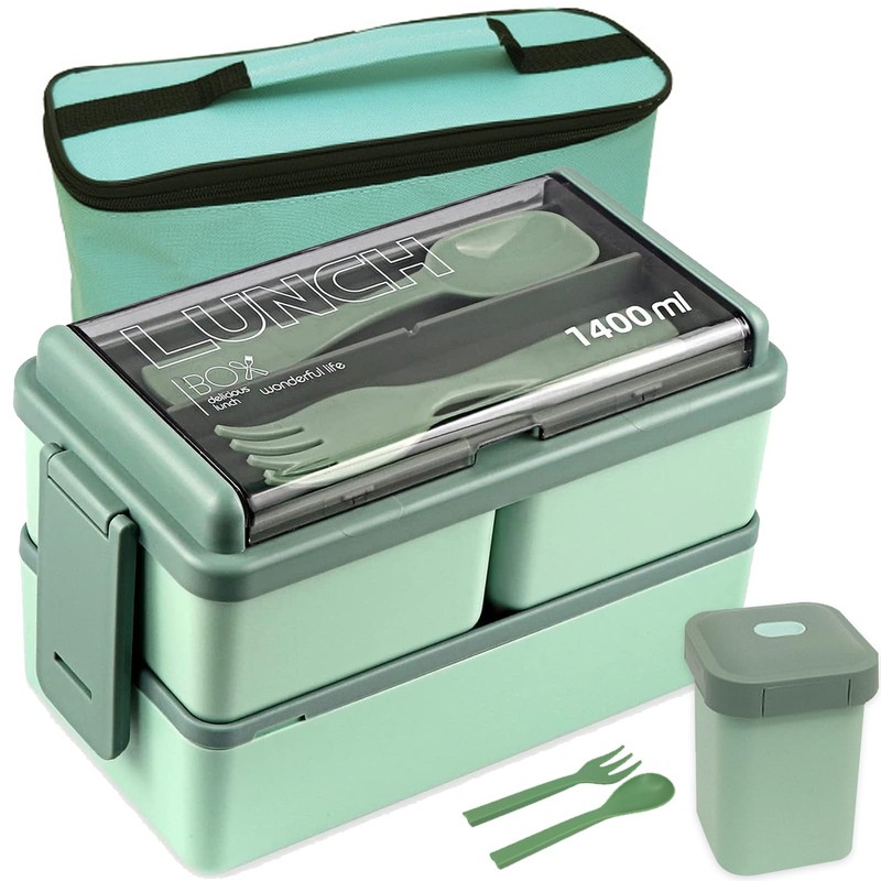 1400ML Lonchera Portátil para Adultos, Bento Box Set de a Prueba Fugas con Compartimentos, Incluye Cubiertos, Bolsa de Almuerzo y Sopa Caja, Lonchera Bento Apto para Microondas y Lavavajillas(Verde)