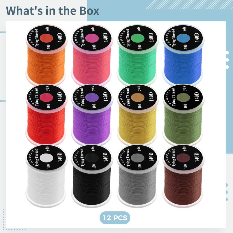 140D Fly Tying Thread Kit, 12 Pcs Non-Waxed Fly Tying Wires, Fly Tying Tieing Supplies for Fly Fishing Lures, Compatible with Most Bobbins, Ideal for 6#-10# Hooks