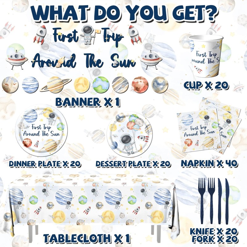 - 【Serve 20 Guests】142pcs space first birthday decorations include 20 dinner plates (9"), 20 dessert plates (7"), 40 square napkins (6.5" folded), 20 space cups, 20 knives, 20 forks, 1 rectangle tablecloth (70.8" x 42.5") and 1 first trip around the sun banner.