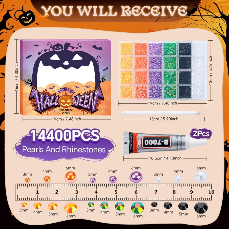 - Get Halloween Rhinestones Pearls: A box of beautiful Halloween flatback half pearls and flatback rhinestones in an assortment of sizes,2 pcs of B7000 Jewelry Glue,1 pcs wax pencil. A white picker pencil is included for you to easy pick up pearls and rhinestones.B7000 glue also included for you to get a Halloween exquisite crafts.Yellow|Orange|Purple|Green|Black|White