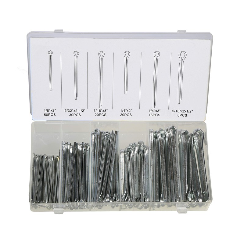 - Set includes: 50pc- 1/8x2", 30pc-5/32x2-1/2", 20pc- 3/16x3", 16pc- 1/4x3", 20pc- 1/4x2", 8pc- 5/16x2-1/2" cotter pins