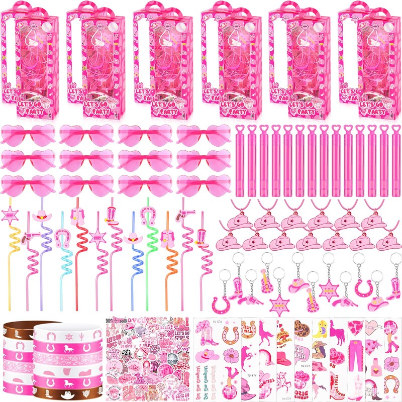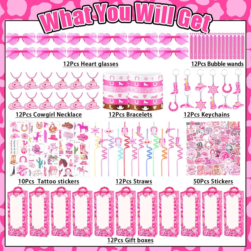 - 【Value 145 Party Gift Pack】You’ll receive 145 pink-themed party gift sets—loaded with 12 heart-shaped glasses, straws, silicone bracelets, cowgirl necklaces, keychains, and bubble wands each; plus 10 cowgirl tattoos, 12 cute cowgirl gift boxes, and 50 cowgirl stickers. This all-in-one bundle is designed to immerse kids in a vibrant cowgirl role-play experience, whether for birthday bashes, classroom celebrations, or holiday gatherings—creating lasting memories they’ll cherish!