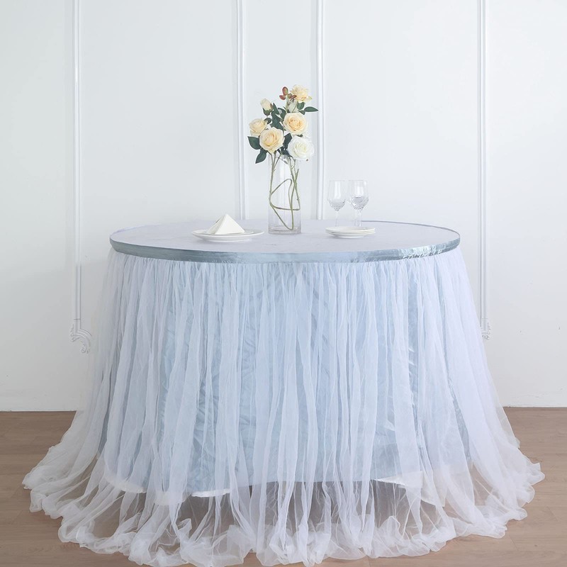 14FT Extra Long 48" Two Layered Tulle & Satin Table Skirt - Dusty Blue | White