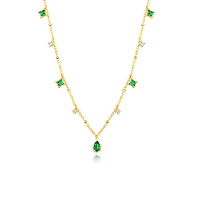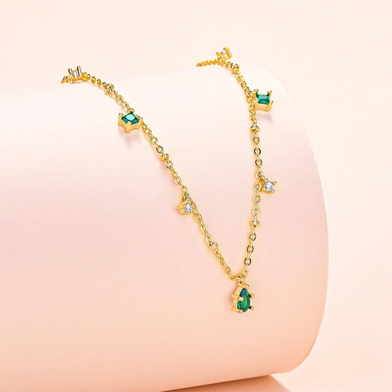 - Green Crystal Necklace: Simple and stylish gold plated necklace with four main stones and a teardrop necklace with four clear zirconia and satellite bead chain for simple elegance.