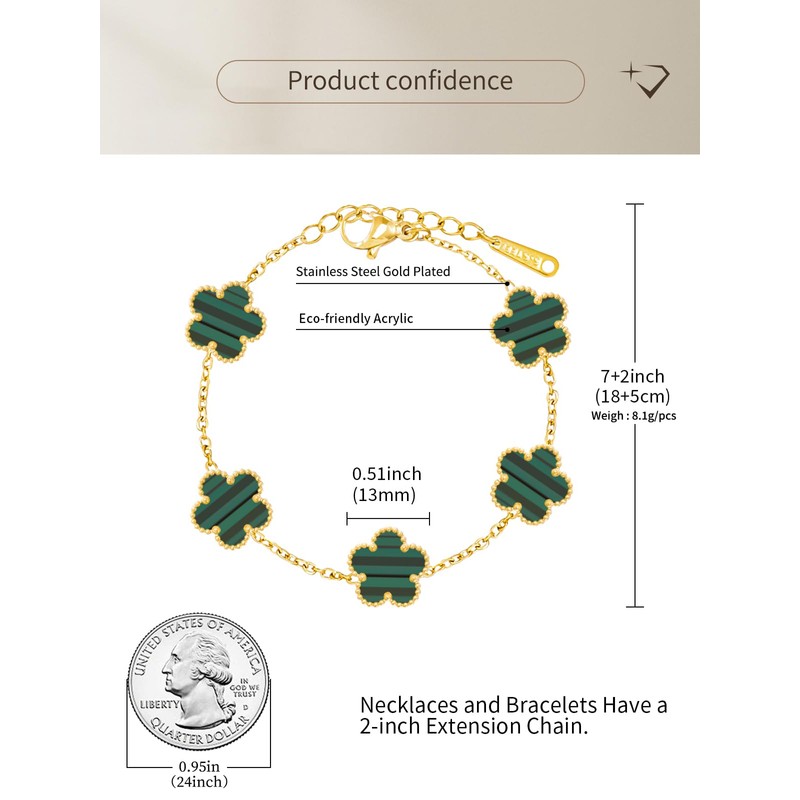 - A Four Leaf Clover Bracelets. These Luck Flower Shaped Jewelry Bracelet Measure 0.52" High 0.5" Wide, 7 + 2 inch Chain. The Weight of These Dainty Bracelets is 9g. These Formal Bracelets Feature Five 11*11mm AAA+ Chalcedony. Hypoallergenic and Nickel free. Gorgeous for Bridesmaids, Prom, Homecoming, Mothers of Bride and Special Occasions; Great for Jazzing Up Causal Attire as Well.