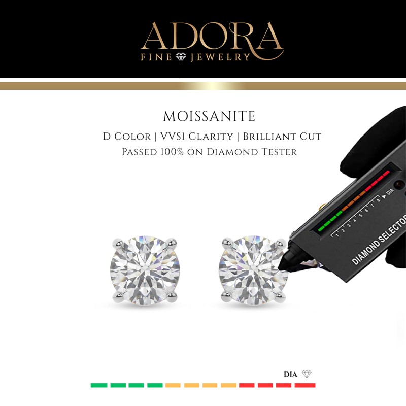 - 💎ABOUT THE JEWELRY: Experience timeless elegance with our Classic Round-cut Moissanite Solitaire Stud Earrings. Crafted in 14K Solid White Gold, the brilliant cut gemstones are securely placed in a 4-prong setting and exude fire and brilliance. Each 4.0mm gemstone has a Diamond Equivalent Weight (DEW) of 0.25 Carats, totaling 0.50 CTW for the pair. These Moissanites shine bright with a VVS1 Clarity, D Colorless Color, and Excellent Cutting Grade. Perfect for everyday. Made in the USA.
