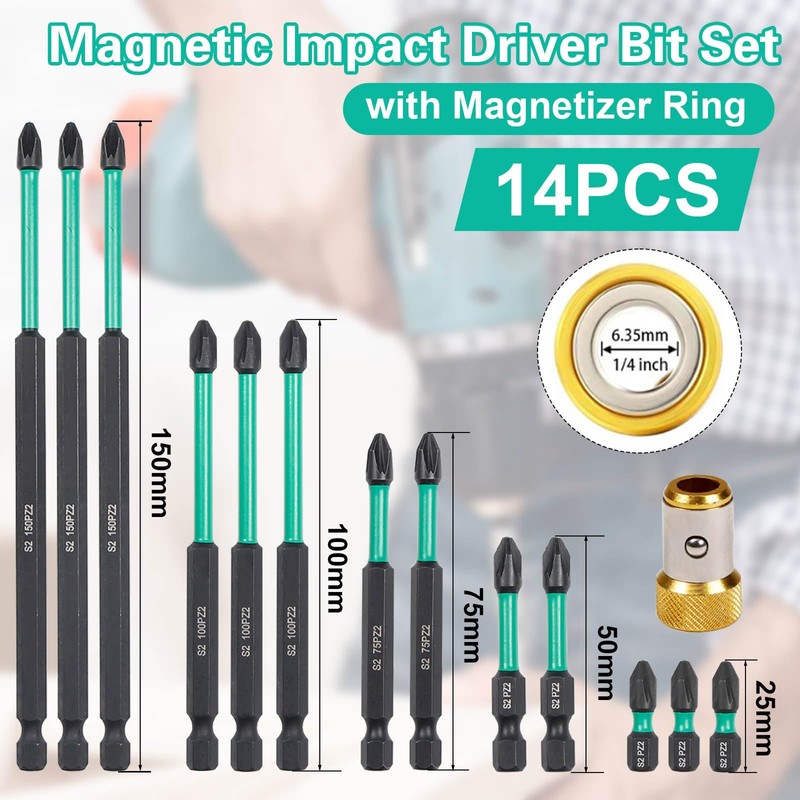 14Pcs PZ2 Magnetic Impact Driver Bits with Head Magnetic Ring, Heavy Duty Long Pozidriv Screwdriver Bit Set, S2 Steel Impact Screwdriver Bits 150mm 100mm 75mm 50mm 25mm