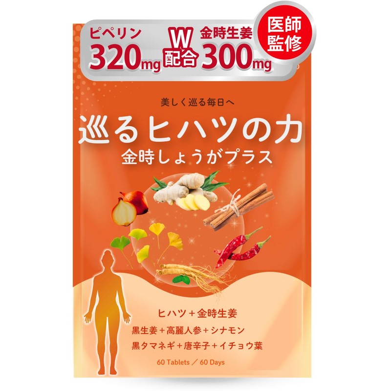 【医師監修】巡るヒハツの力 金時生姜プラス ヒハツ サプリ 【ヒハツ粉末15,000mgxピペリン320mg(320000μg)配合】 ピペリン GMP国内工場製造 (1袋)