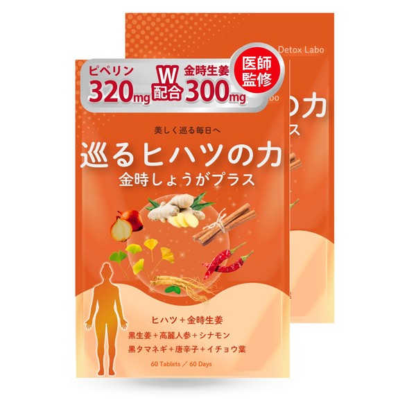 【医師監修】巡るヒハツの力 金時生姜プラス ヒハツ サプリ 【ヒハツ粉末15,000mgxピペリン320mg(320000μg)配合】 ピペリン GMP国内工場製造 (2袋セット)