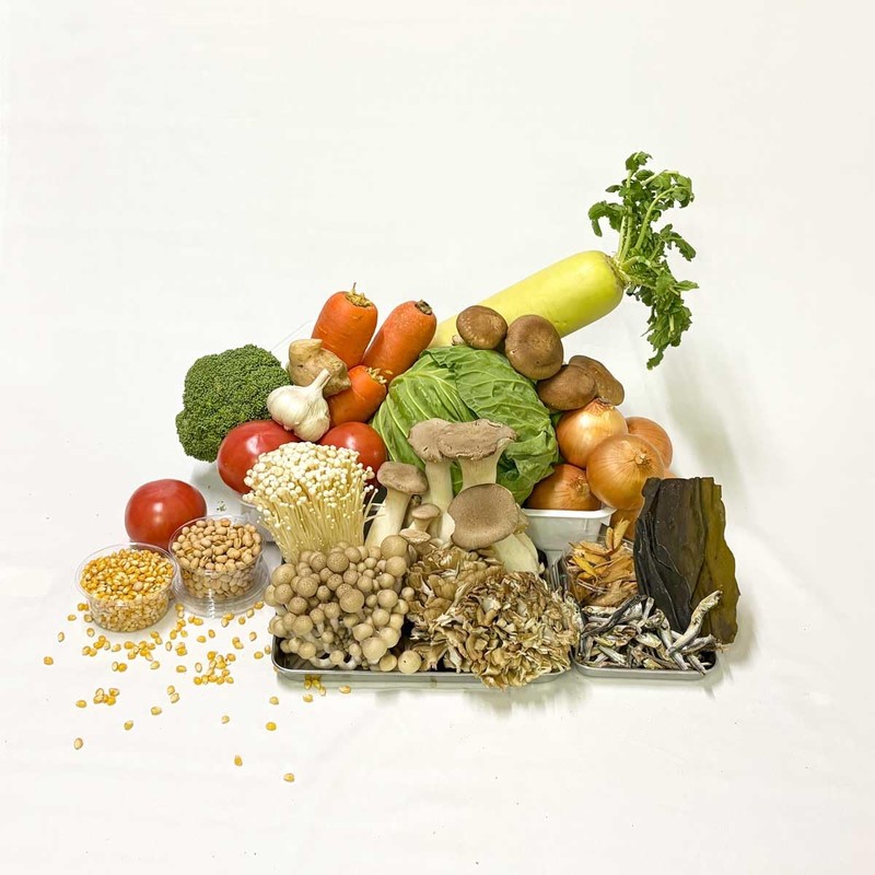 • 原材料:大根、キャベツ、ブロッコリー、トマト、人参、玉ねぎ、しいたけ、えのき、ブナシメジ、エリンギ、舞茸、サバ節、ウルメイワシ節、煮干し(カタクチイワシ)トウモロコシ、ニンニク、昆布、ショウガ、大豆(きな粉)、牡蠣パウダー   *素材は全て日本製です。