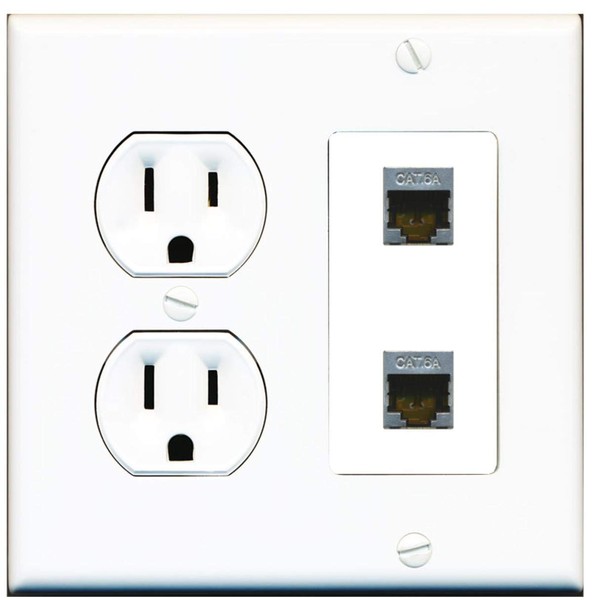 15 Amp Round Power Outlet 2 Port Cat6a Shielded Ethernet Wall Plate White