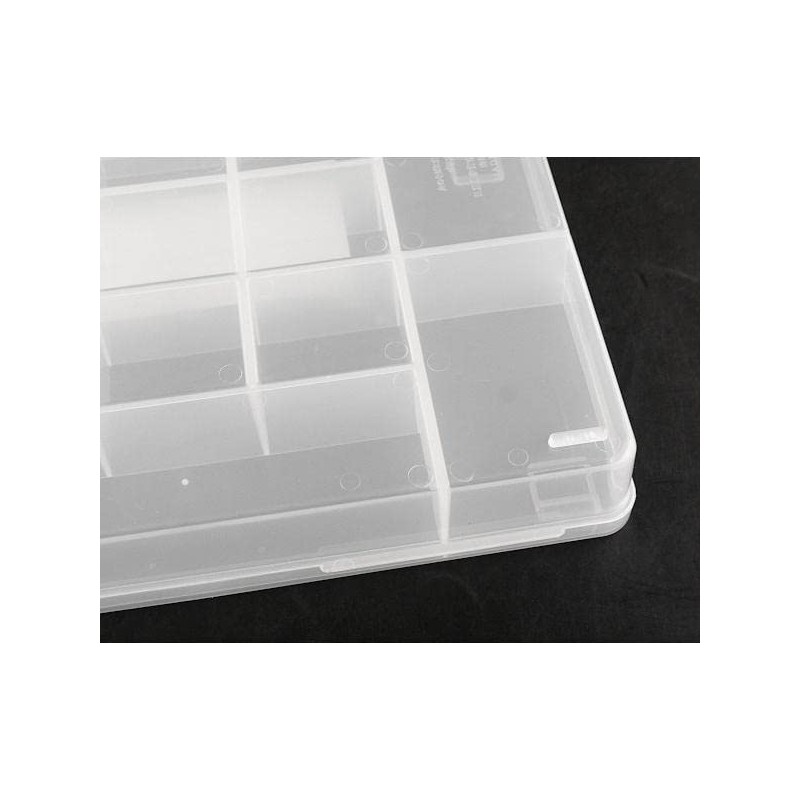 • A divider case. 1 large (approx. 6.9 x 1.5 x 1.2 inches (17.4 x 3.9 x 3.1 cm), 2 of approximately 3.1 x 2.0 x 1.2 inches (7.9 x 5 x 3.1 cm), 12 small (4.3 x 3.9 x 3.1 cm), and 15 cm) in total. Fixed dividers. Cases stack together Stacks in place Convenient for organizing various small items