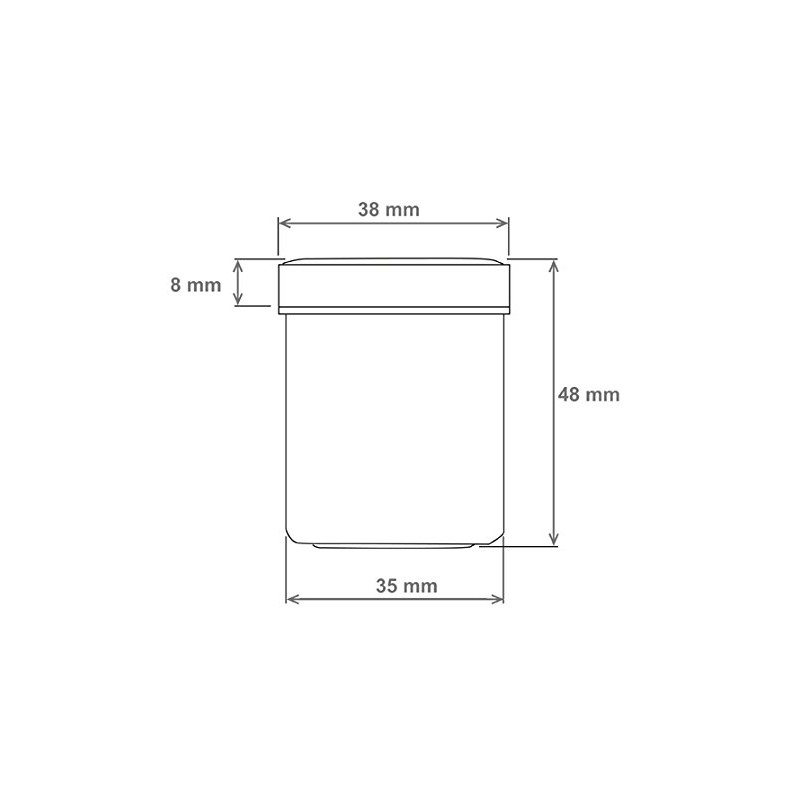 - Box: diameter 35 mm, height 48 mm, lid: diameter 38 mm, height 8 mm