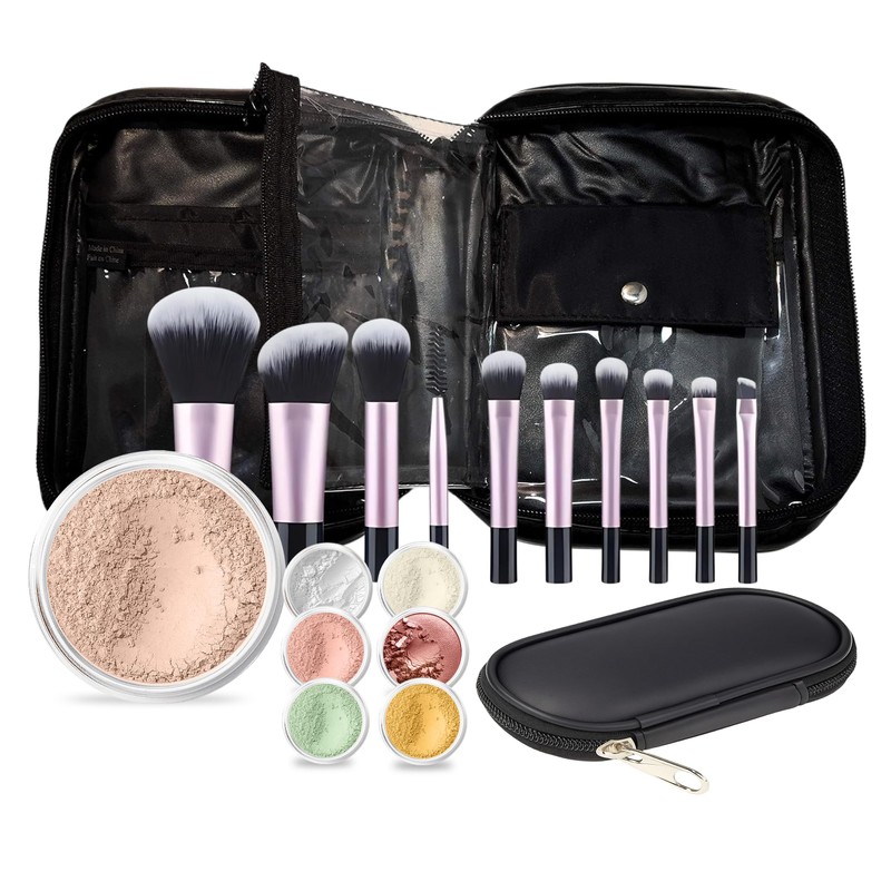 This Kit Includes: Foundation (1 included) is a 20 gram sifter jar filled to capacity with 9 grams of powder. Face Powders (6 included) are 5 gram sample size jars filled to capacity with 2 grams of powder. This Kit Includes: Mineral Foundation: Sweet Face Minerals foundations are all natural and very lightweight. Sweet Cheeks Blush: A soft and natural earth toned pink color. This shade is very mild. Mineral Bronzer: Bronzer can be applied on top of your foundation. Use as an eye shadow, on the face for a sun-kissed appearance or as a complete body shimmer. Our Bronzer has a natural SPF and comes in a beautiful copper tone leaving your skin looking radiant while illuminating a soft focus summertime glow. Miracle Veil: This veil is completely translucent and works with all skin types and tones. It can be worn under or over your makeup, providing the ultimate finishing touch. Our veil products absorb excess oil and moisture, infuse pure softness and dramatically reduce the appearance of pores, fine lines and wrinkles. Use for a balanced, flawless look and a long lasting appearance. Perfection Finishing Powder: This silky feather-soft powder provides weightless, breathable layering to your skin. Brush it on after your makeup has been applied. It's light and delicate and gives the appearance of perfection! Yellow Corrector: Yellow correctors work great at covering dark circles under the eyes and toning down pink skin giving a more natural look. Green Corrector: Green correctors are far more effective in covering redness on the skin. 1 Black Cosmetic Bag: When opened the bag is approximately 11.5". Closed, approximately 6" x 8". Black shiny plastic exterior with 3 different departments. 6 Piece Brush Set with Protective Case: All in a neat black matte carrier which fits perfectly in your make-up bag. 6 Pc. Brush Set.