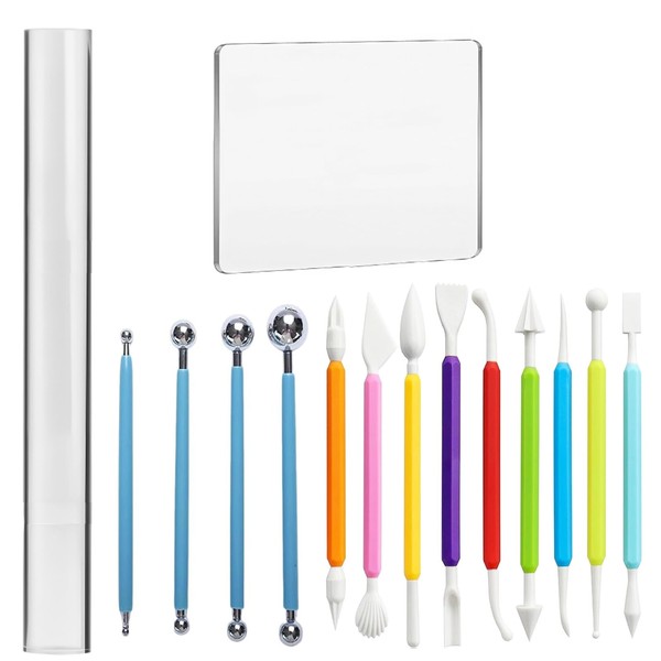 15 PCS Basic Polymer Clay Tools, Dotting Tools, Clay Sculpting Tools Acrylic Roller Pin, Clear Rectangle Sheet Press Board, Double-Ended Pottery Carving Set for Beginner