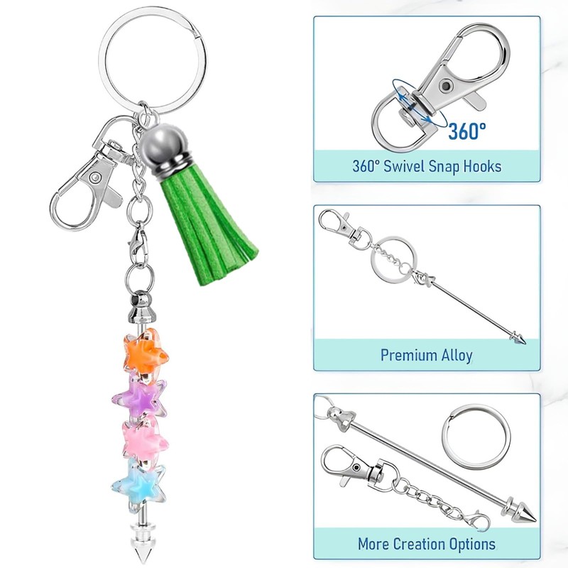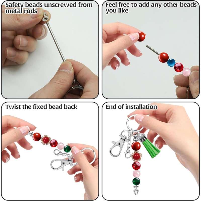 • Easy to use: It is very convenient to use a beaded key chain. All you have to do is unscrew the nut on the metal rod, add your favorite bead or pendant (beads are not included in the set), and then tighten the nut to secure the bead to the rod to get the key chain. The process is simple and fun. Not only can you add beads and pendants to our keychain making kit, you can also add different jewelry accessories or special-shaped keyrings.