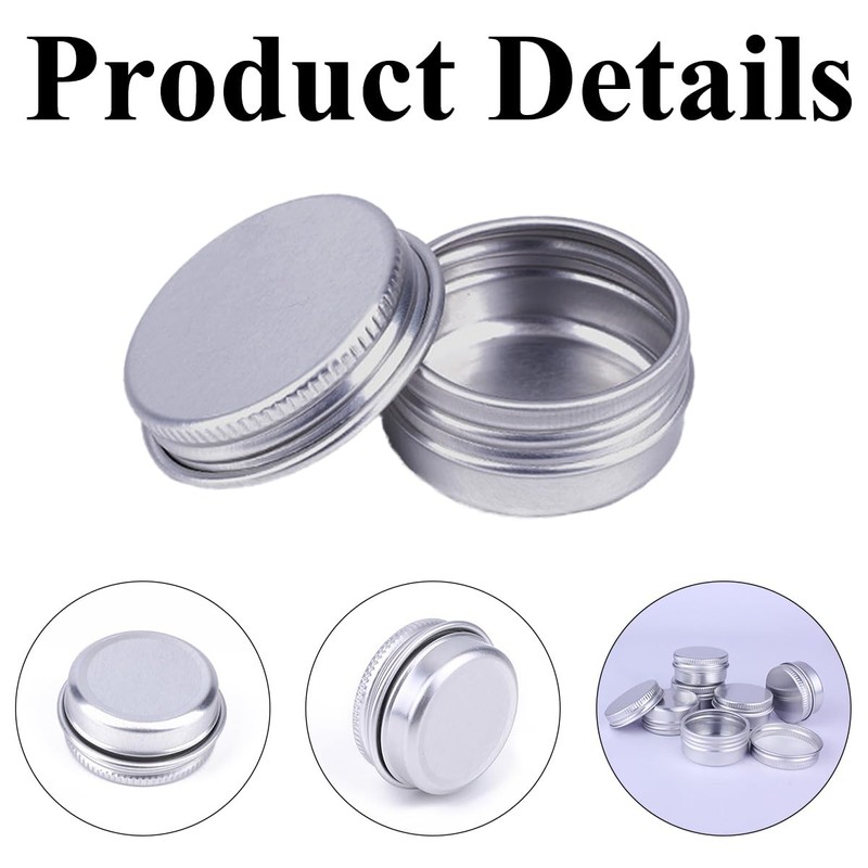 Size: 35x18mm/1.37x0.70in< br > Material: Aluminium< br > Color: Sliver < br > Packing List: 15Pcs x Small tins with lids< br >< br > Features:< br > 1.Small tins with lids have a capacity of 10 ml/0.33 oz.< br > 2.Sample pots are suitable for pharmaceuticals, laboratory research samples, small jewellery, paints etc.< br > Note: < br > 1. There may be slight color differences due to different monitors. < br > 2. Due to manual measurement, please allow a certain margin of error.