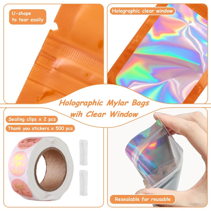 - Super-value Packs: You will receive 150 pieces of 4 x 6 inches holographic orange mylar bags, a roll of thank you stickers (500 pcs), and two sealing clips. Offering an abundance of options for various applications and lightweight & portable design for on-the-go convenience.